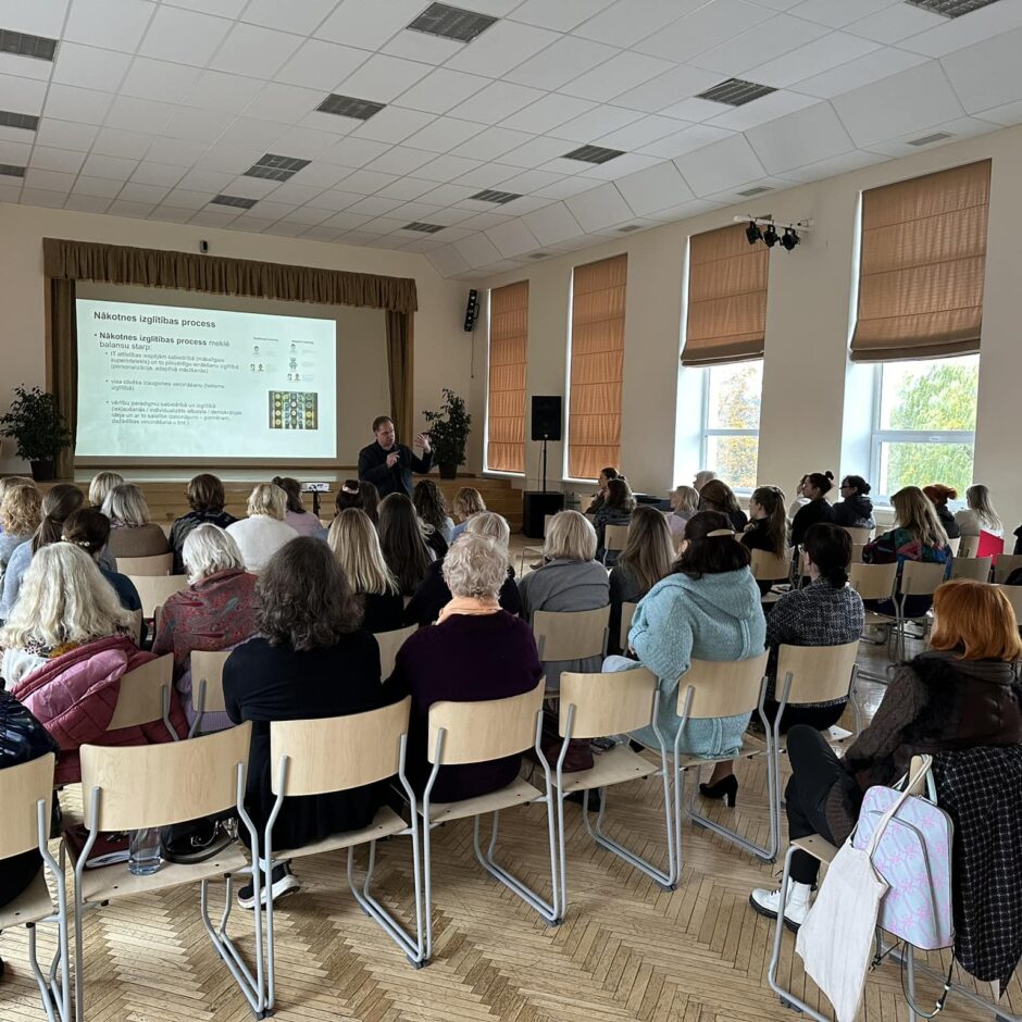 22. oktobrī mūsu skolā viesojās Izglītības kvalitātes valsts dienesta Kvalitātes nodrošināšanas departamenta direktors Rolands Ozols ar lekciju mūsu skolotājiem “Iespējas pedagogu un izglītības iestādes darbā”. Lekcijā ne tikai tika atgādināts par dažādiem izglītības jomas un izglītības kvalitātes aspektiem, bet arī bija ierosme diskutēt par iespējām skolotāju darbā, izglītības jomā kopumā un tuvāko un tālāko nākotni darbā ar skolēniem. Tomēr, lai cik interesanta nākotne mūs sagaida, pamatlietas, kas jāapgūst katram skolēnam ir nemainīgas – lasīt, rakstīt, rēķināt un domāt.