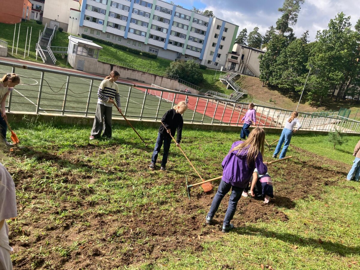 Paldies skolas tehniskajiem darbiniekiem par pļavas pamatnes iekārtošanu un kritalām, dir. vietniecei Zanei Mundurei par koordinēšanu, sēklu un sīpolu iegādi.